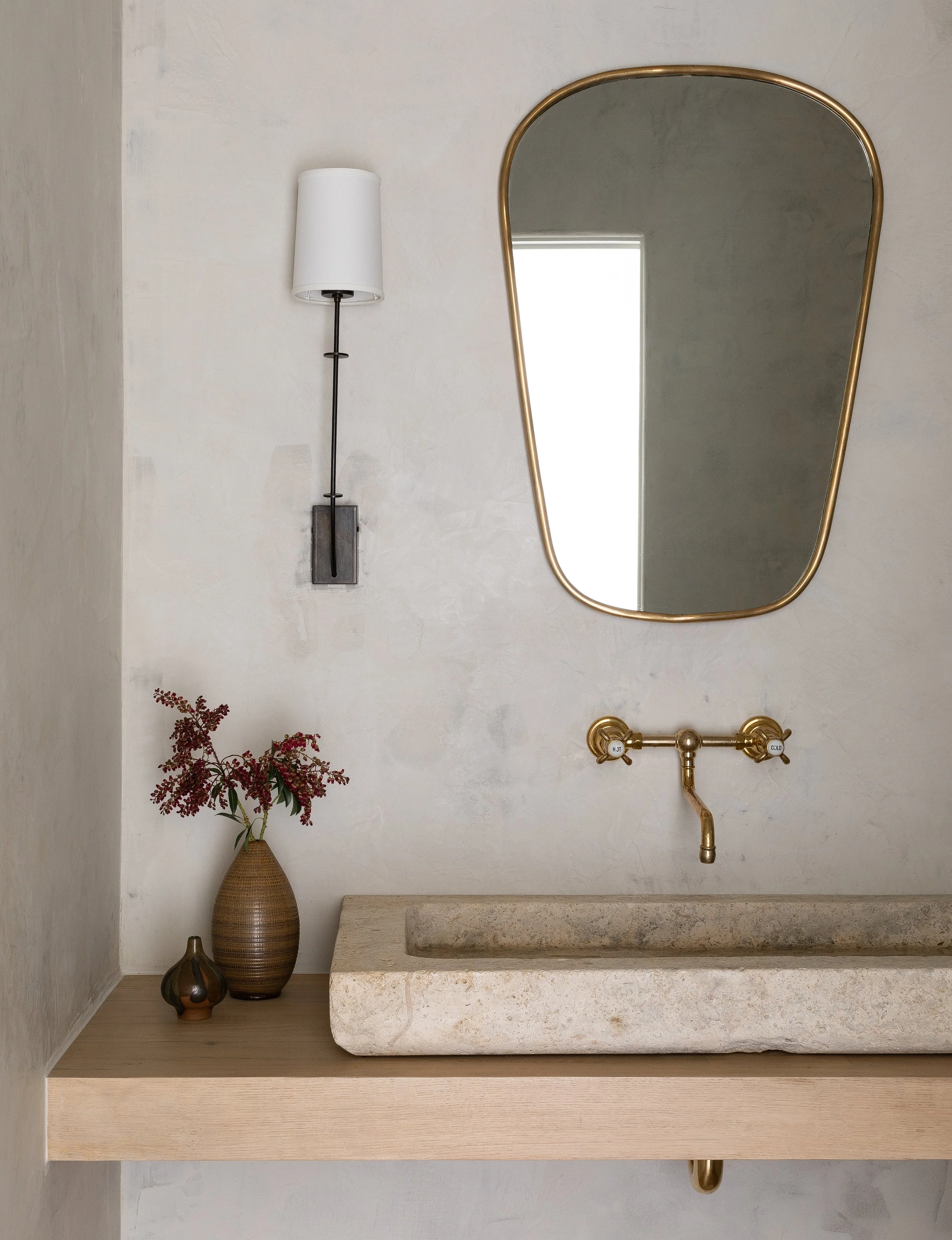 Of course, we we thrilled when she launched her recent collaboration with Anthropologie. Her bouclé ottoman and sofa are fantastic examples of how textured elements can transform an everyday object into something special. The looped mirror is a beautiful way to bring a subtle pattern into a space, and is there anything more welcoming at the end of a long day than this embroidered duvet? For an affordable bathroom refresh, we love the combination of this vanity and sconce.
